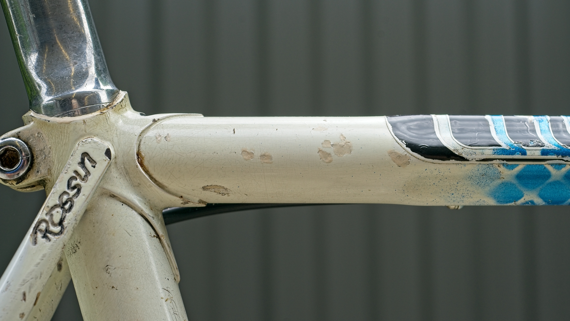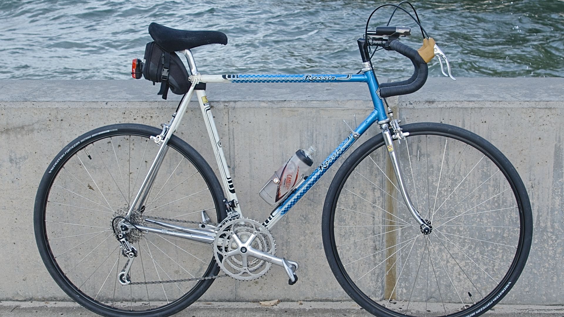 Frank is the Audax/gravel machine which started as a well preserved Rossin Professional of mid 80’s vintage. Frank had some changes made after I broke the crank, and now has a few features you may not see anywhere else such as a long cage Super Record rear derailleur. Combined with a triple chainring and low gears on the back, Frank laughs at the biggest hills while cruising effortlessly down the road.